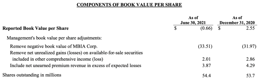 MBIA est composé de deux filiales principales : Corp et National. Les fonds propres de l'ensemble sont négatifs. En retraitant MBIA Corp, la book value monte à 32,85$ par action au 30 juin 2021, contre un cours de bourse oscillant ces dernières années entre 6$ et 12$.