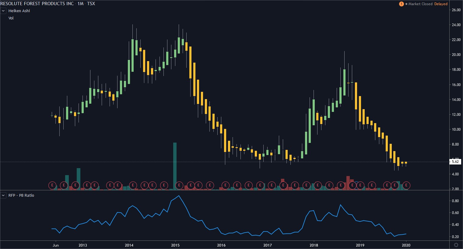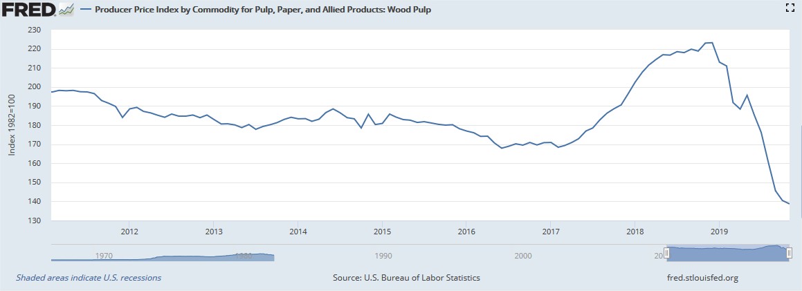 L'évolution de l'action suit l'évolution du prix de la pulpe de bois et du papier, qui descend bien ces dernières années. Cyclique ou non telle est la question, mais les données de la FRED sont incomplètes pour répondre.