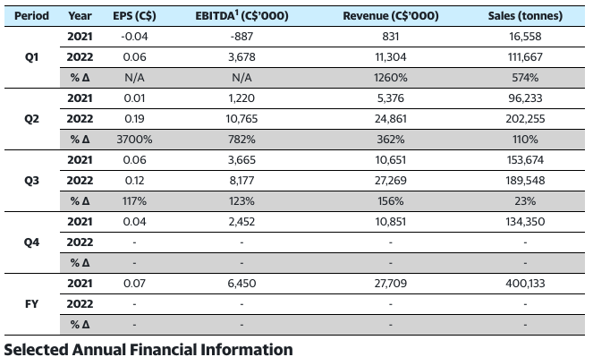 - hausse de 23% des ventes en volume (189 548 tonnes vs. 153 674 au Q3 2021);