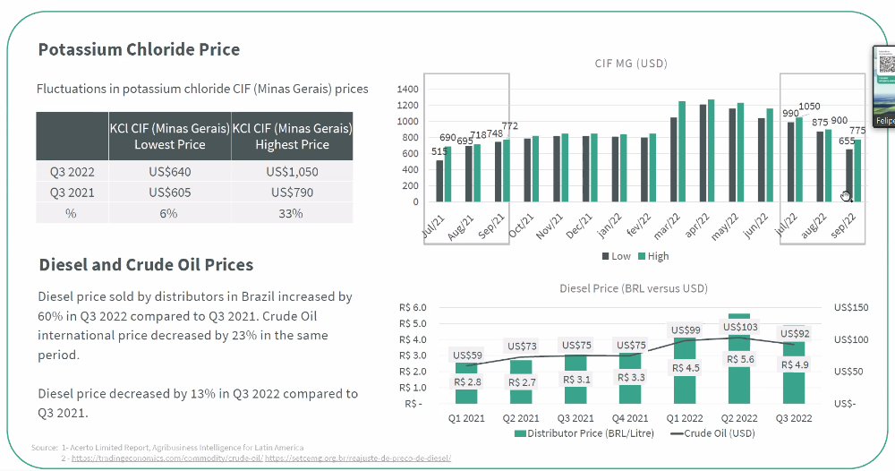 Les cours de la potasse au Brésil ont baissé récemment. C'est logique car ils étaient très hauts et Verde a fait ses prévisions sur un prix de potasse en dessous des cours du pic. Les cours de la potasse ne sont pas un sujet d'inquiétude. Verde reste et restera rentable. Une potasse à prix d'or aurait l'avantage de remplir plus vite les caisses pour financer le développement, rembourser les dettes et récompenser les actionnaires. Mais Christiano indique que les stocks de potasse au Brésil sont à niveau très élevés. La peur de manquer de potasse suite à la guerre en Ukraine et aux sanctions a conduit les acteurs brésilien a un approvisionnement de précaution. Qui va peser sur les cours alors que la basse saison arrive. Donc prudence. L'envolée des cours vécue en 2022 ne devrait pas se reproduire en 2023.
