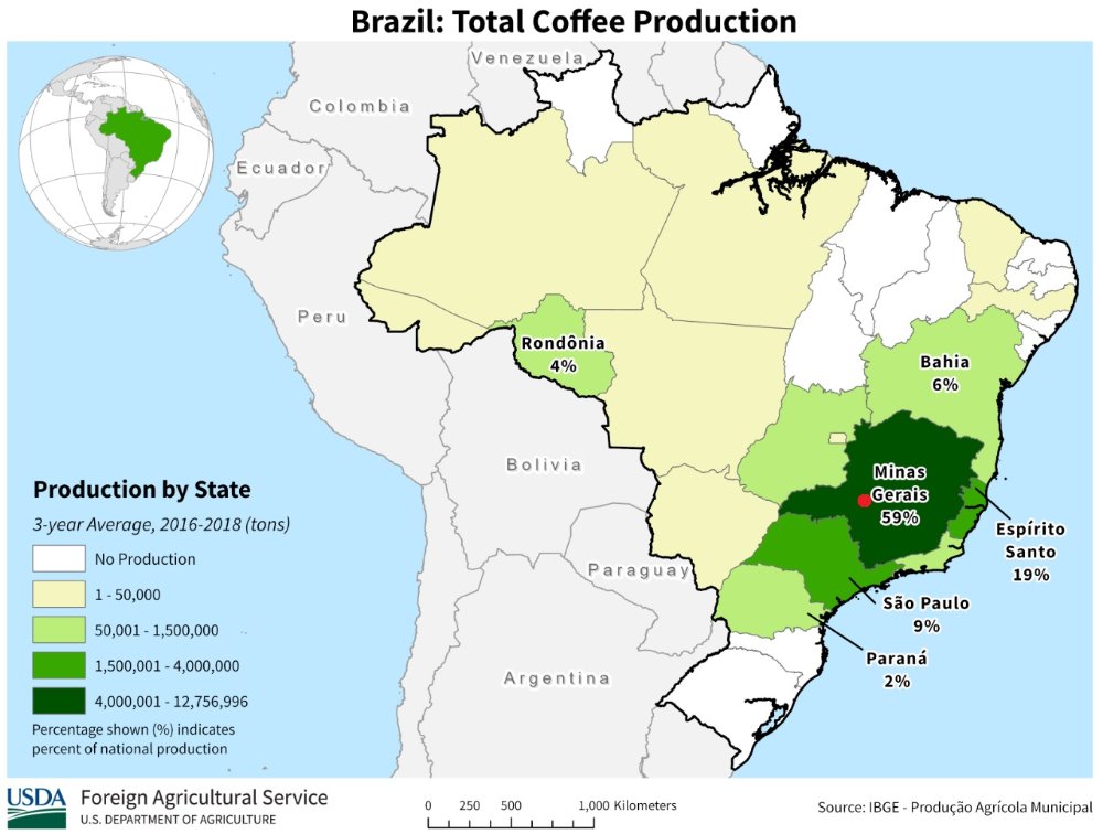 Un anecdote pour finir. Je ne sais pas s'il est visionnaire ou opportuniste mais j'aime beaucoup la réponse faite par Christiano à un investisseur potentiel lors d'une réunion récemment. Celui-ci lui demandait si le produit de Verde était bon. Christiano lui a dit d'aller lire les avis sur Amazon. Ce marché de niche où la glauconite est vendue très chère pèse peu dans l'activité mais Christiano s'en sert comme d'une vitrine. Et fidèle à la tradition, il offre une réduction de 5% lors de la conférence téléphonique. Verde est décidemment une entreprise bien de son temps : écologique et numérique. A défaut de convaincre des institutionnels (la conférence Morgan Stanley semble avoir été décevante), j'ai l'impression que Verde se constitue au fil du temps une base solide d'investisseurs individuels curieux qui font leur devoirs. Grâce notamment aux efforts de communication et d'explication de Christiano et de son équipe (bravo pour la rapidité et la qualité des communications).okavongo a écrit : ↑21 octobre 2022, 17:41Plus important pour le temps long, l'USDA (US Departement of Agriculture) propose des cartes de la planète avec les différentes productions agricoles. Les productions brésiliennes sont regroupées sur cette page. Je me suis principalement intéressé au café (culture favorable au produit de Verde du fait de l'absence de chlorure) et au soja (star au Brésil). Le point rouge correspond à peu près à la localisation de la glauconite de Verde : Les cultures de Soja sont assez éloignées de Verde (mais aussi des ports brésiliens pour les 25% du Mato Grosso). Par contre, les cultures de café sont idéalement placées. Si les cours de la potasse baisse ou si les coûts de transport augmentent trop, voilà le marché naturel de Verde, le socle qui assurera sa rentabilité par tous les temps. Le cours du café mérite donc peut-être d'être surveillé du coin de l'œil. La production brésilienne aussi, même si cela semble difficile d'avoir des données fiables.