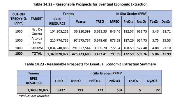 Baume : 1 145,62 Mt à 3 358 ppm de TREO, avec 769 ppm de MREO,