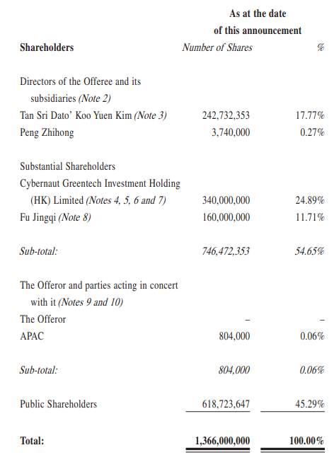 Tan Sri Dato’ Koo Yuen Kim et Fu Jingqi agissent de concert. En fait le premier a vendu ses actions à la 2ème en lui prêtant de l'argent et en en conservant les droits de vote si ChatGPT a bien compris. Je pense que Metals X va essayer d'aller chercher les 28% du capital dans les 45% non deténus par les gros actionnaires. Pour contrôler la majorité de Greentech il faudra réussir à convaincre soit Cybernaut, soit son patron malaisien qui contrôle 29% des droits de vote. Si MLX arrive à acheter 28% du capital, alors 3 blocs avec 25 à 30% du capital seront aux manettes. Dans quelle ambiance ?