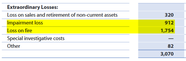 On a la confirmation que la dégradation des résultats est bien lié à des charges non récurrentes : dépréciation d'actifs (="impairment loss") et surtout à l'incendie.