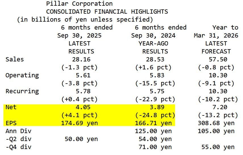 Les marges se rétablissent et permettent de dépasser le bénéfice semestriel de l'année dernière : 175 JPY / action vs. 167 JPY / action n-1. On note un gain exceptionnel de change sur le semestre de +135 M JPY vs. une perte sur le semestre n-1 de -118 M JPY. Éléments par définition non récurrents.