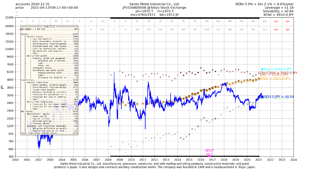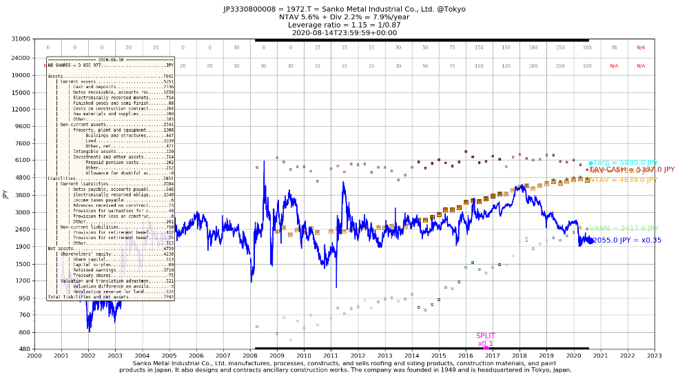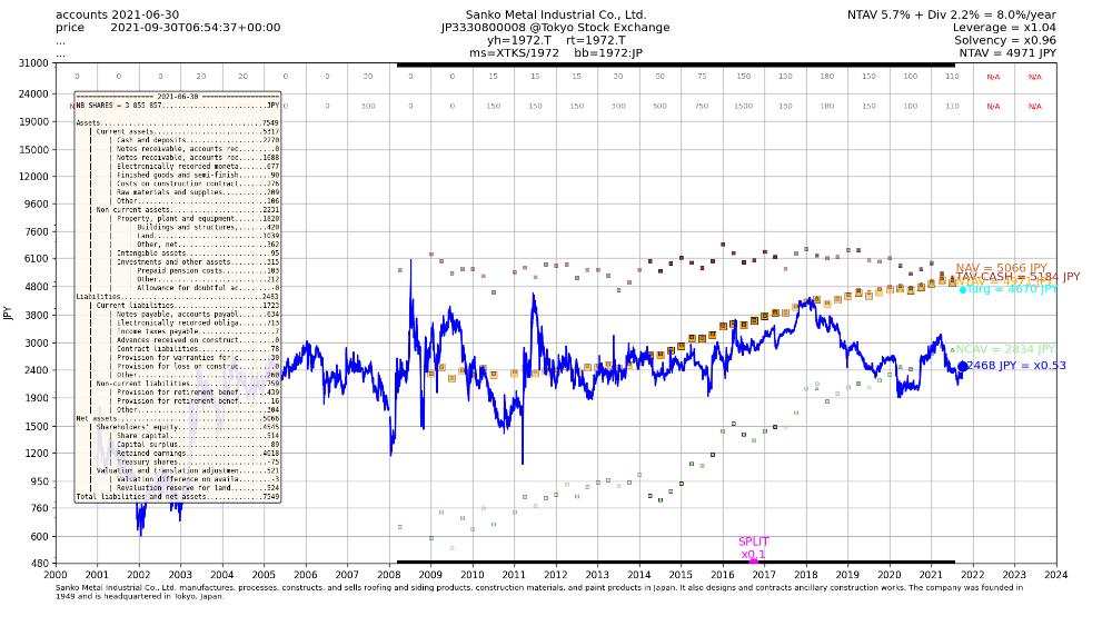 L’indice Topix ressemble de loin à la courbe du cours de Sanko Metal Industrial, sauf la reprise depuis mai 2020. Espérons que la société se porte bien et que le marché rattrape son décalage.