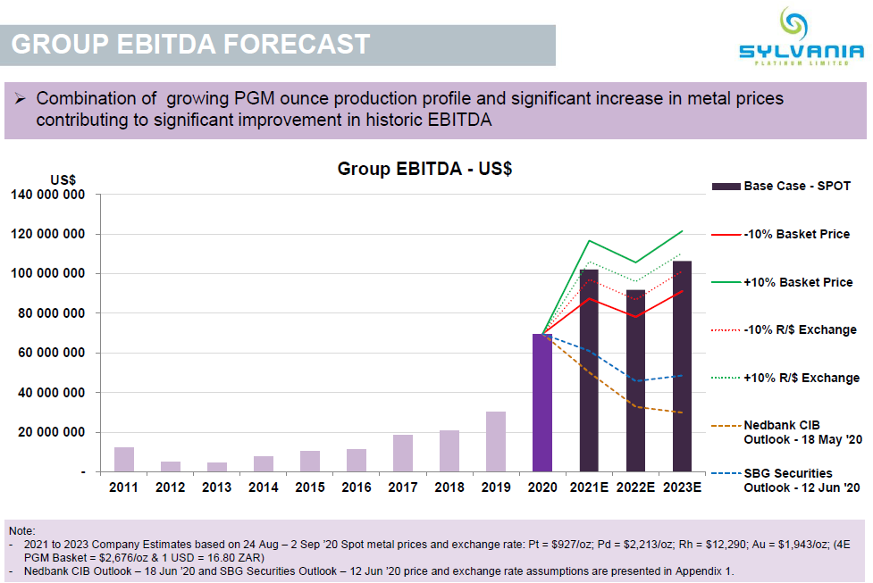 L'explication est simple : les cours des sous-jacents. Sylvania base tous ses calculs sur les cours actuels. Certes nous ne sommes pas sur des prospectives fantaisistes ou hyper optimistes mais ils considèrent quand même la hausse récente comme acquise... Et le panier actuel (24/08-2/09) est à 2 676 $/once. Ça vaut la peine de s'arrêter sur ce point. Le panier moyen pour le dernier trimestre était historiquement élevé et à 2 107 $/once (1 654 $/once il y an un an, 1 167 $ / once il y a 2 ans). +27% de hausse par rapport au dernier trimestre on comprend que les projections d'EBITDA soient excellentes ...
