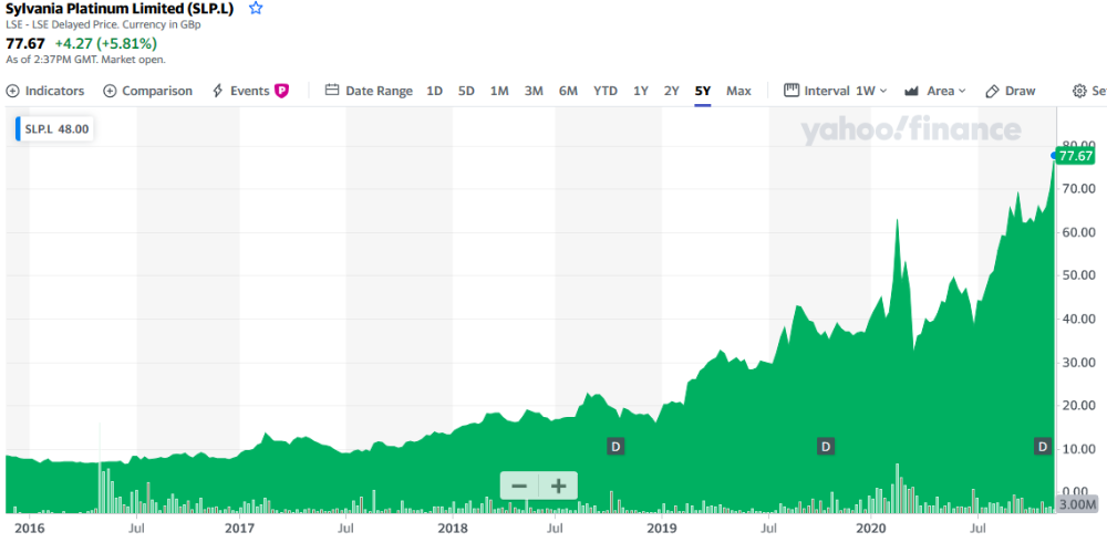 Acheter à 0,45 GBp c'est prendre le bateau en marche car l'action a quand même doublé depuis qu'elle a été embarquée dans la pirogue. Sylvania me semble être une bonne boite mais c'est surtout la hausse du palladium, du rhodium et à un degré moindre du platine qui a permis la hausse récente du titre. Acheter aujourd'hui, c'est parier que soit le palladium et le rhodium vont continuer sur leur lancée, soit le platine va essayer de rattraper un peu le palladium. Sans hausse des sous-jacents, le potentiel de l'action me semble plus faible même si les bons résultats peuvent avoir un effet positif. Bref, pour acheter maintenant il faudrait avoir une vraie conviction sur les platinoïdes.