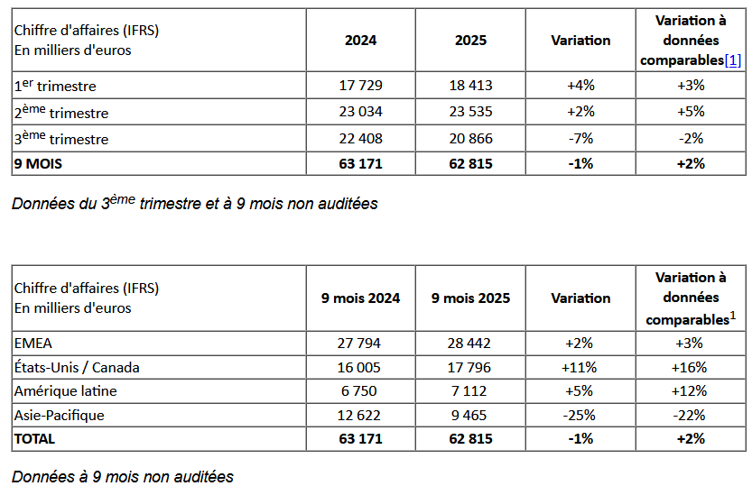 - Les ventes de la région Amérique latine ont progressé de +5% sur neuf mois (+12% à données comparables) à 7,1 M€.