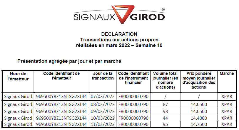 Après une pause de 4 mois (derniers achats fin mars), Signaux Girod profite d'une chute des cours pour reprendre ses petits rachats d'actions.