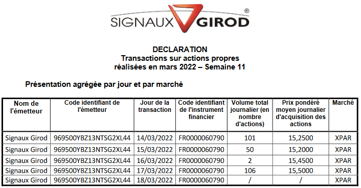 Signaux Girod a acheté 134 actions sur les semaines 42 et 43 à un cours moyen de 12.28€