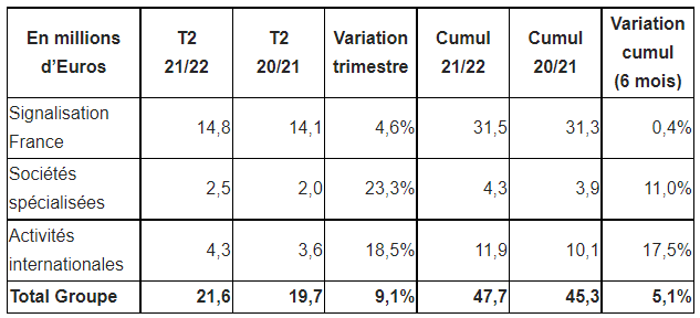 1-Le pôle signalisation France est en retrait de -3,1% à 16,7M€ contre 17,2M€ pour le T1 2021. La raison avancée est une activité moins soutenue sur ce pôle.