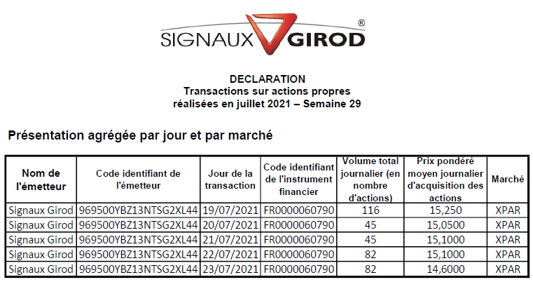 Pour la semaine 28, 532 actions rachetées pour un prix d'achat allant de 14,6 à 15,25 et toujours pour annulation.