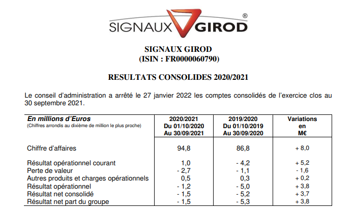 [ajout de la source] : https://ml-eu.globenewswire.com/Resourc ... e7a42441ddSignaux Girod a réalisé au troisième trimestre 2020/2021 un chiffre d'affaires de 24,3 millions d'euros, en hausse de 34,7%. Le spécialiste des panneaux de signalisation avait été fortement impacté par le Covid au même trimestre de l'an dernier. En France, le chiffre d'affaires de ce trimestre progresse de 37% et retrouve ainsi un niveau habituel. L'activité a néanmoins été freinée par des perturbations liées à la raréfaction des matières premières et une météo très défavorable pour les activités de marquage au sol.