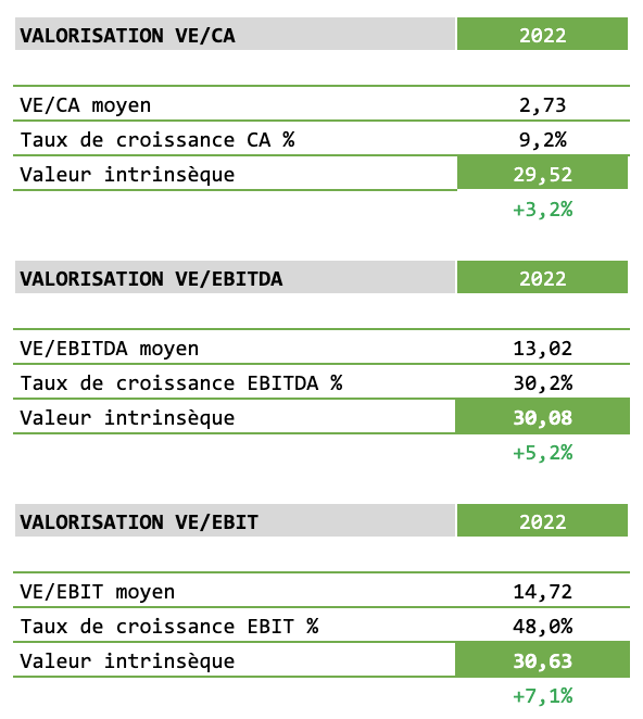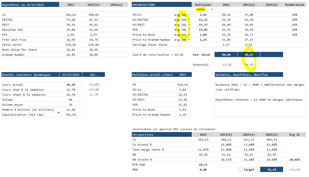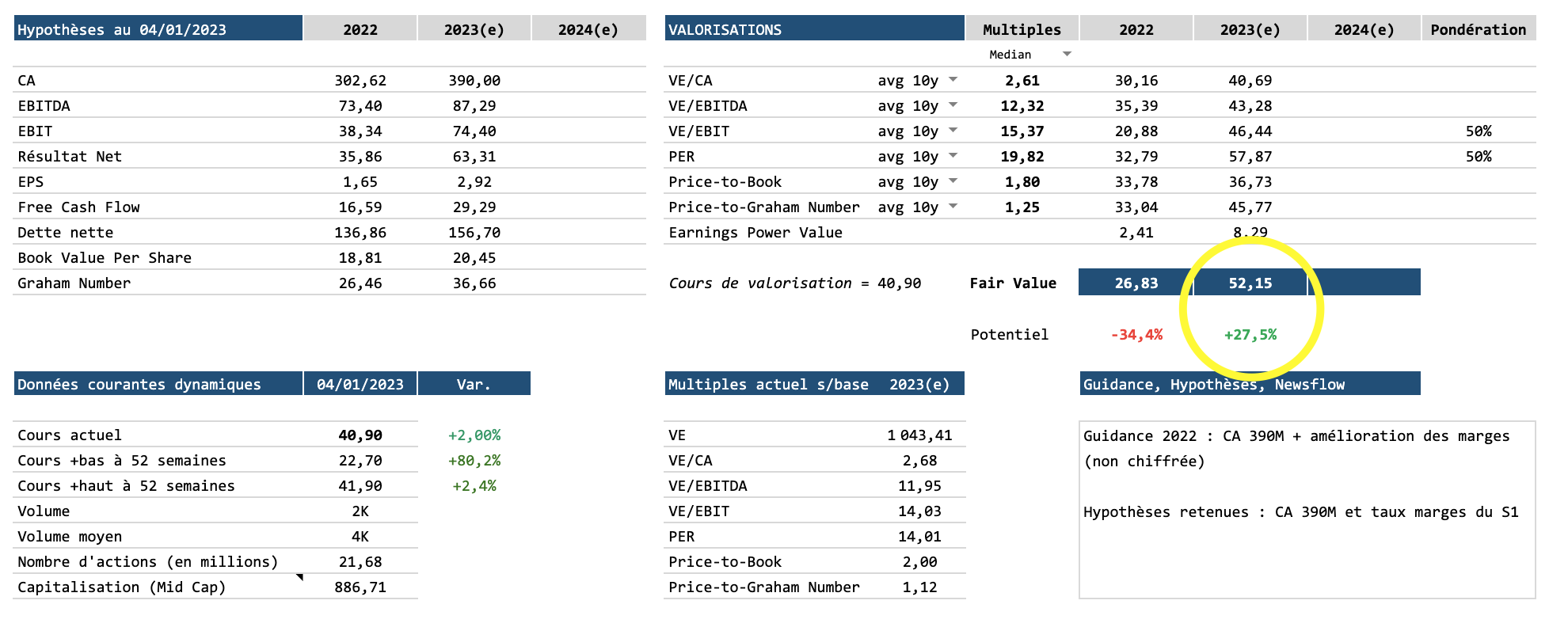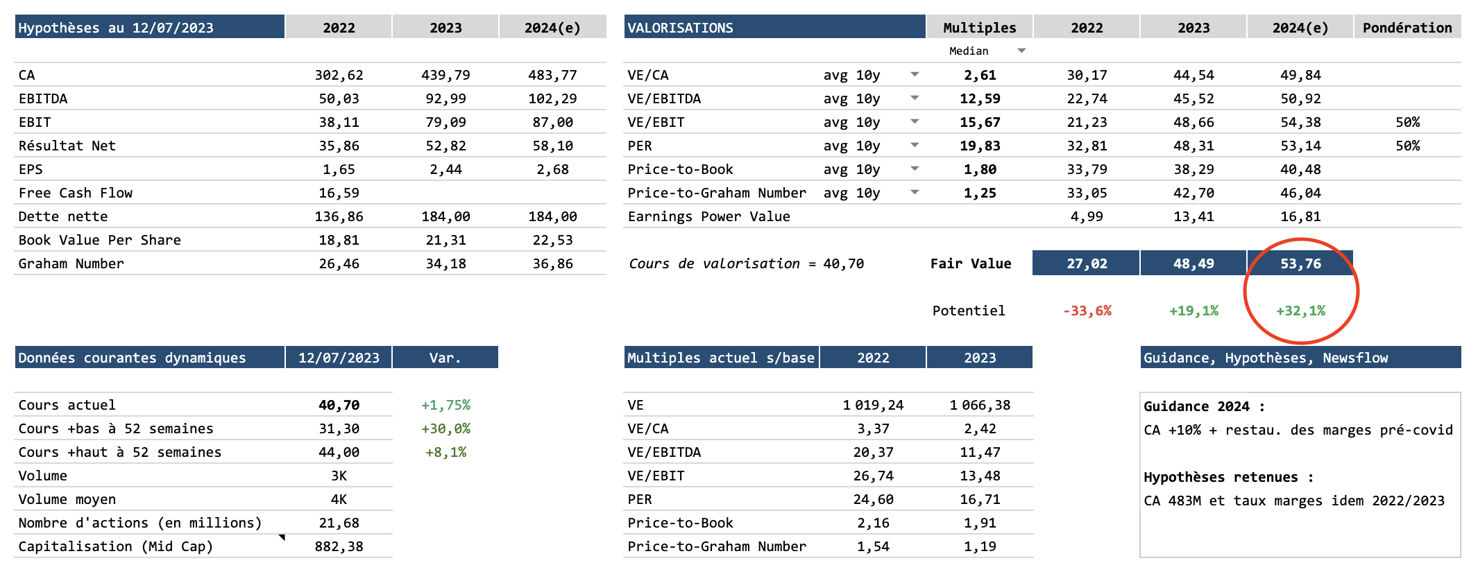 Actualisation de la valorisation : Fair Value estimée à 53.76 EUR soit potentiel de +32% en mixant VE/EBIT et PER.