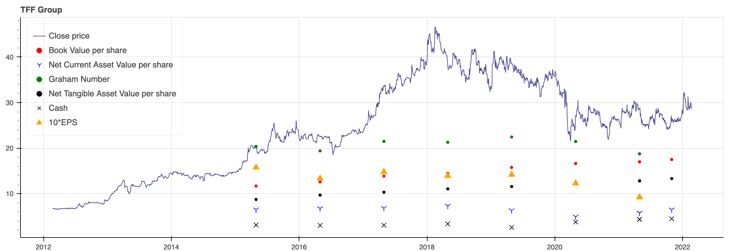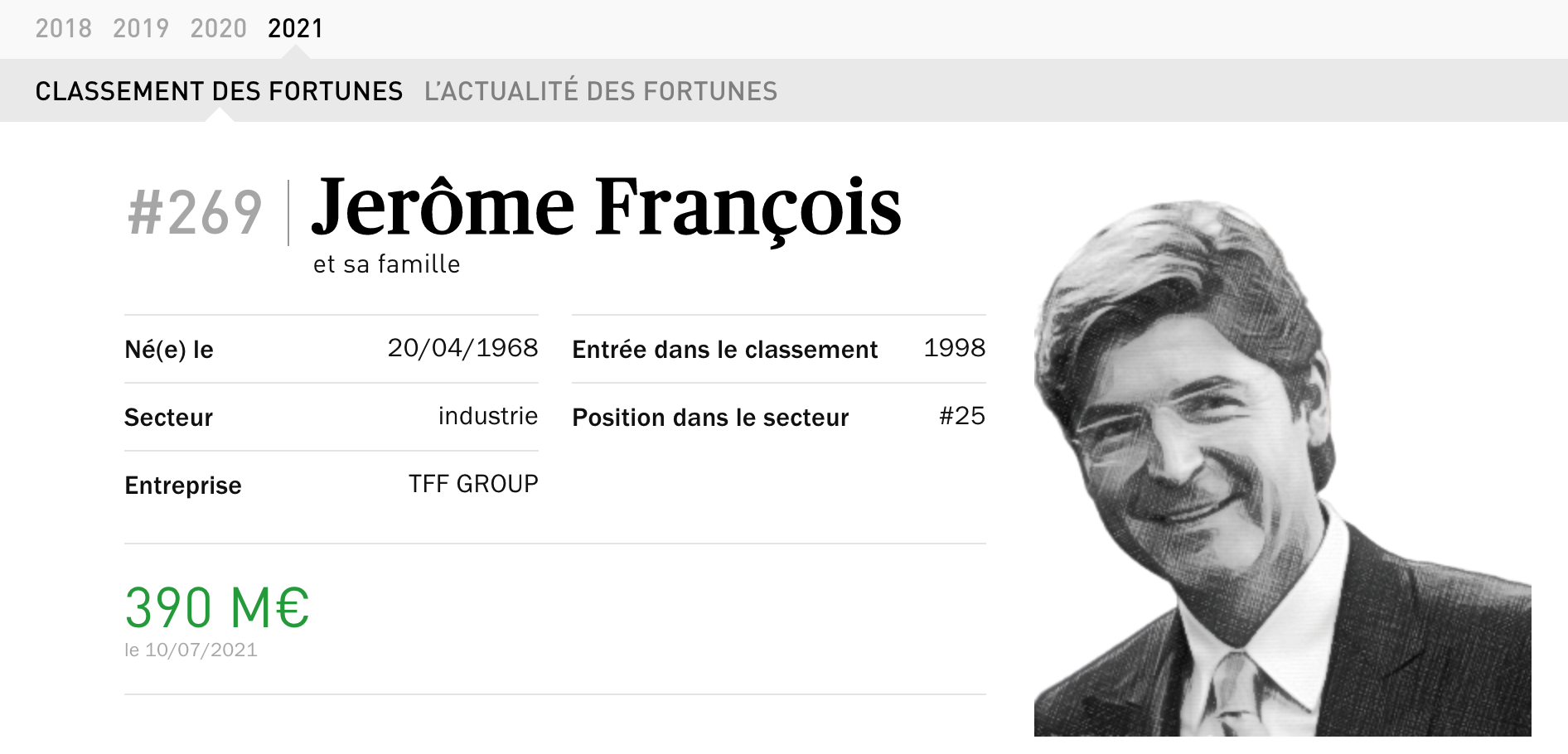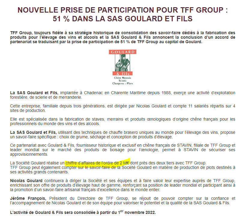 TFF Group est un leader dans la tonnellerie. Au fil des 30 dernières années le groupe s’est construit avec de solides barrières à l’entrée qui l’ont placé aujourd’hui comme la référence mondiale dans le domaine. Cocorico, c’est Frenchy ! Rien ne semble freiner les ambitions de Jérôme François. Le Groupe souffre depuis 3/4 ans de multiples maux (règlementation, covid, intempéries, pénurie de MO, coût des MP) et il serait difficile de cumuler plus de freins au développement. De nombreuses sociétés auraient déjà sombré pour moins. Et pourtant, TFF résiste, courbe l'échine, rogne ses marges mais je suis confiant dans leur capacité à rebondir et les perspectives de croissance sur le secteur Alcools et plus particulièrement le Bourbon pourraient être de bons vecteurs en cumul d'une sortie post-covid.