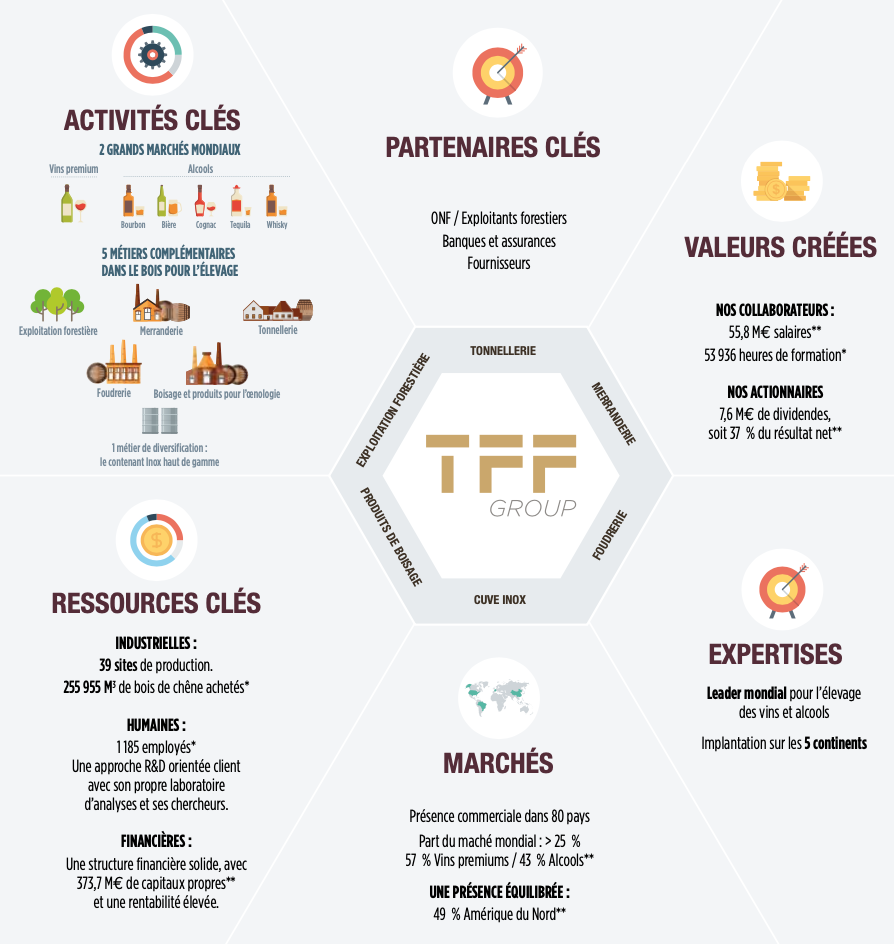 - maîtrise de la chaîne de production complète par intégration verticale (approv. bois avec l’exploitation forestière, découpage dans les scieries, récupération des déchets pour les activités de boisage en oenologie, façonnage des fûts, entretien et réparation des fûts, négoce)