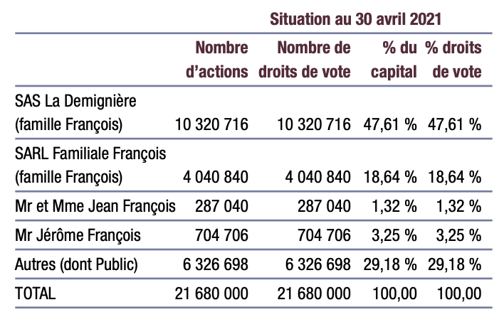 A ce sujet, lors de l’apéritif donné après l’AG, j’ai eu l’occasion d’échanger avec M.Herman Wielfaert, président de Creafund, 2e plus gros actionnaire après la famille. Il m’a dit avoir proposé ce dossier aux François car même si certains vignerons peuvent se montrer récalcitrants face à ces liquides de boisage et leur caractère innovant, avoir un pied dedans maintenant permettrait de ne pas arriver en retard sur ce segment de marché s’il venait à décoller. Cela participe également à la diversification de l’activité.