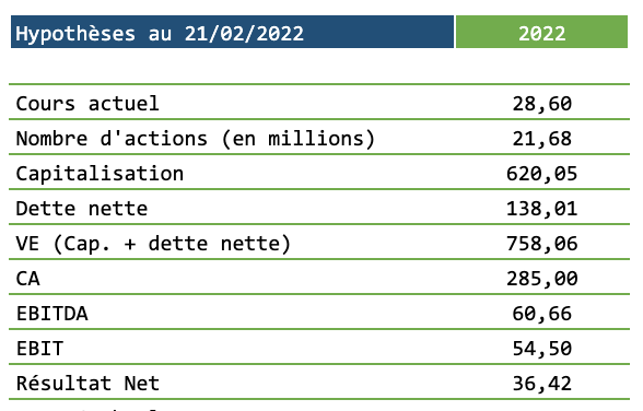 A ce rythme et en supposant un CA sur le T4 de 71.65M (1/2 du S1), celui-ci pourrait s'élever à 287.75M pour 2021/2022, ce qui correspond à mon hypothèse de valorisation à 285M alors que l'objectif de TFF est de 260M (très prudent me semble-t'il).