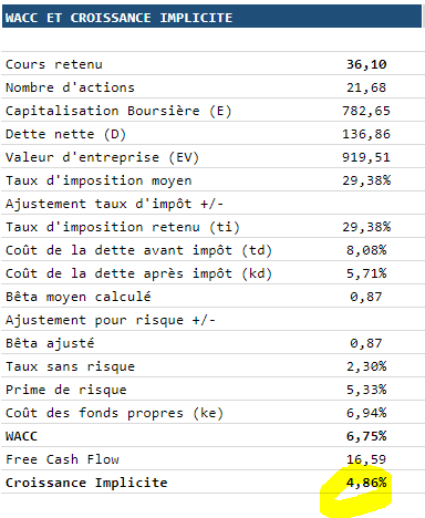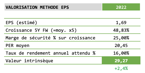Sur la base du cours actuel de 28.60€ avec les hypothèses ci-dessous j'obtiens une Valeur Intrinsèque de 30.39€ soit un potentiel de seulement +6.3%, ce qui n'est bien sûr pas suffisant pour rentrer à l'achat maintenant. Une décote de -30% est le strict minimum syndical soit une entrée vers les 22.5€. Je vise plutôt la zone des 17.5/16.0€ pour acheter cette belle valeur à bon prix.