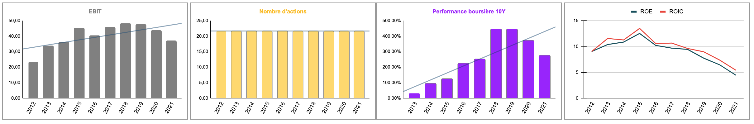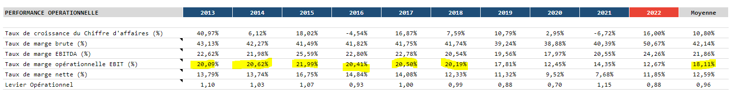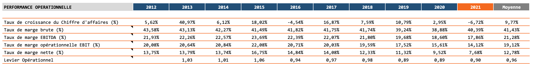 Performance Opérationnelle : En moyenne, taux de marge brute de plus de 40%, c'est remarquable. Les marges sur EBITDA et ROC sont aussi très généreuses. Ceci témoigne d'une très bonne gestion opérationnelle, mais là aussi les 4 dernières années affichent une tendance baissière sur les marges opérationnelles et nettes. La société souffre de tous les effets "Covid" mais reste toutefois robuste.