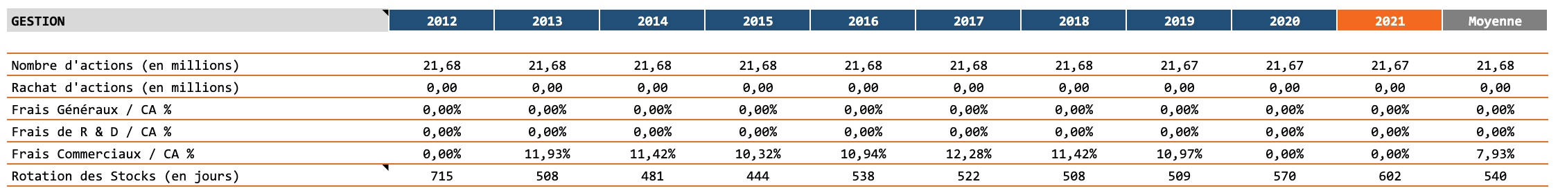 Gestion : Nombre d'actions stable, pas de dilution. Dommage qu'il n'y ait pas quelques rachats. La rotation des stocks s'allonge. Point à creuser.