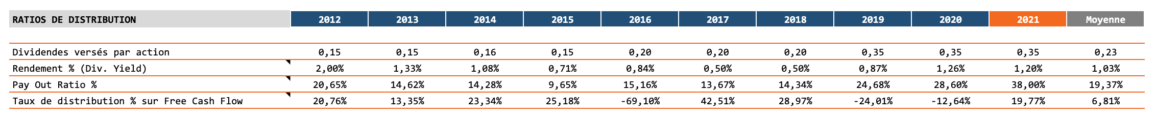 Distribution : versement récurrent mais très faible rendement puisque celui-ci est de 1.03% en moyenne. Vraiment pas de quoi s'extasier mais rien de surprenant pour une société familiale dont la priorité est la création de valeur.