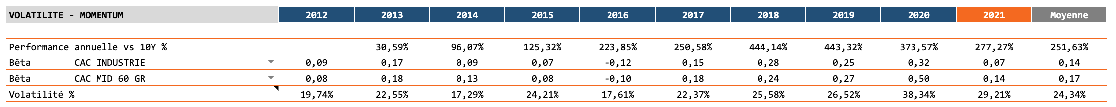 Momentum : le cours fût à son apogée en février 2018 et depuis il est en baisse et en phase avec les difficultés rencontrées par la société. A ce jour le cours reflète la valeur telle que je la valorise ci-après. Les objectifs de croissance et de retour aux beaux jours devront se voir pour que le marché les accueillent chaleureusement.