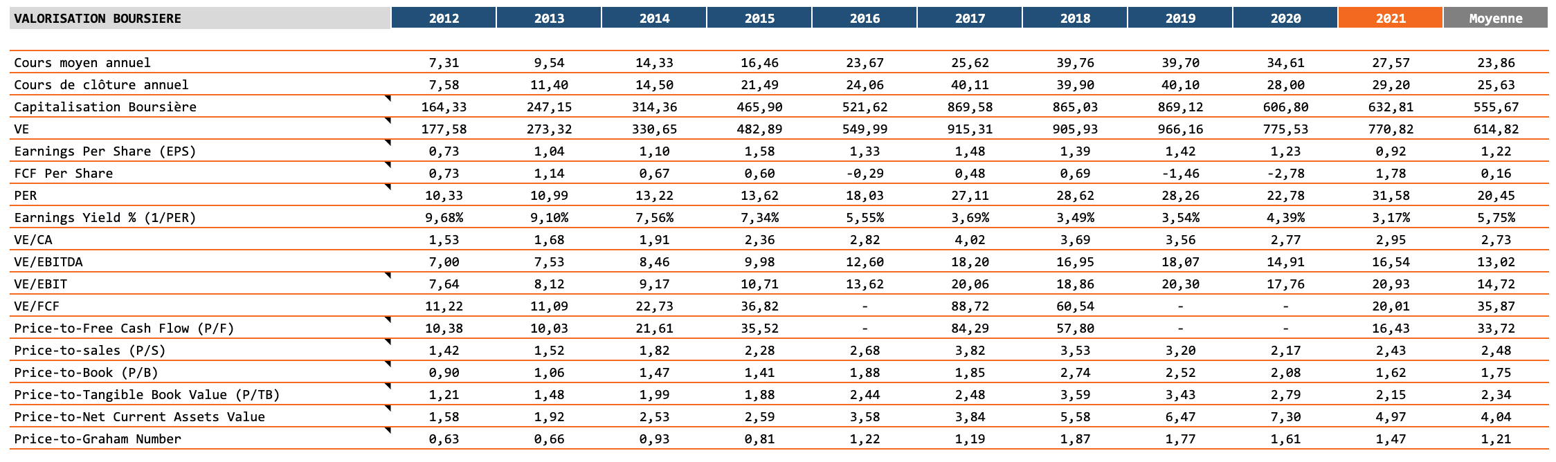 NB : comme je l'ai déjà évoqué le Marché apprécie et paye cher cette valeur et c'est ce qui me retient pour l'acheter d'autant qu'elle est largement exposée aux fluctuations du dollar. Je ne suis donc toujours pas actionnaire à ce prix là même si la valorisation sur les multiples historiques affiche toujours un potentiel significatif.