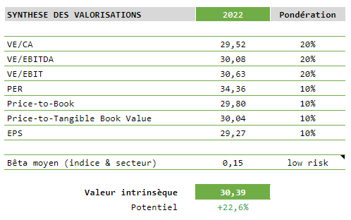 A ce stade, la décote reste malheureusement encore assez faible pour rentrer à l'achat avec un potentiel élevé d'autant que nous ne savons rien des autres ratios financiers à l'heure actuelle. Sur la base du cours actuel et en gardant les mêmes hypothèses que dans mon analyse la valorisation ressort à 30.39 EUR soit un potentiel de +22.6% comme ceci :