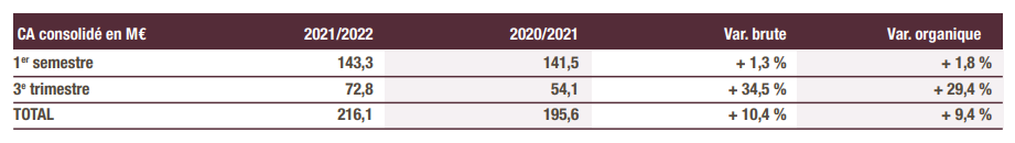 TFF Group publie ce jour son chiffre d'affaire sur les 9 premiers mois d'exercice 2021/2022 (clôture 30/04/22) faisant état d'une belle progression de +10.4%.