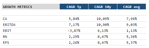 Rentabilité : ROE/ROIC proches de 10% en moyenne. Pas exceptionnel mais honorable quand même. La baisse de rentabilité depuis 4 ans est toutefois un point de vigilance à garder en mémoire. Espérons que les activités Alcools apporteront plus de retour.