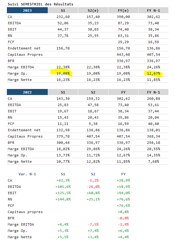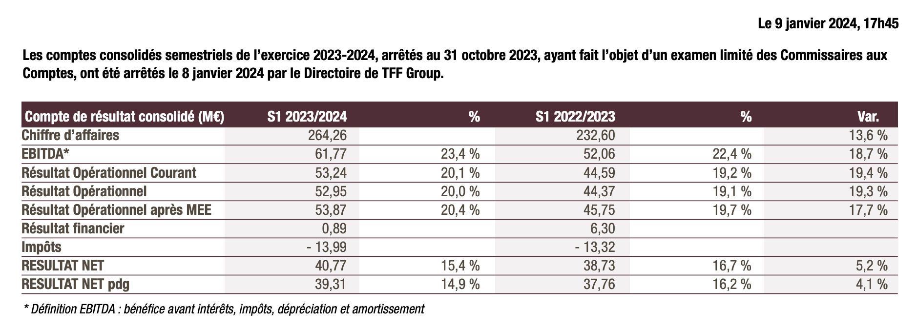 TFF publie ce jour ses Résultats semestriels. Ils sont très bons avec une croissance de +13.6% (dont 17.1% en organique) vs une guidance annuelle de +10%. C'est le pôle Alcools (Whisky & Bourbon) qui tire fortement cette croissance à hauteur de +25% alors que le pôle Vin ne croit que de +3.5%. Cette croissance se traduit dans les résultats avec un EBIT qui progresse de +19.3% et une marge opérationnelle qui passe de 18% en N-1 à 20% sur ce 1er semestre (+2 points). Au final le Résultat Net, amputé de l'augmentation du coût de la dette et d'un moindre impact positif de change, termine à 39.31M en hausse de ("seulement") +4.1% vs S1/23. On note au passage que cette forte croissance s'accompagne d'un endettement supplémentaire de +36% passant de 184M à 251M.