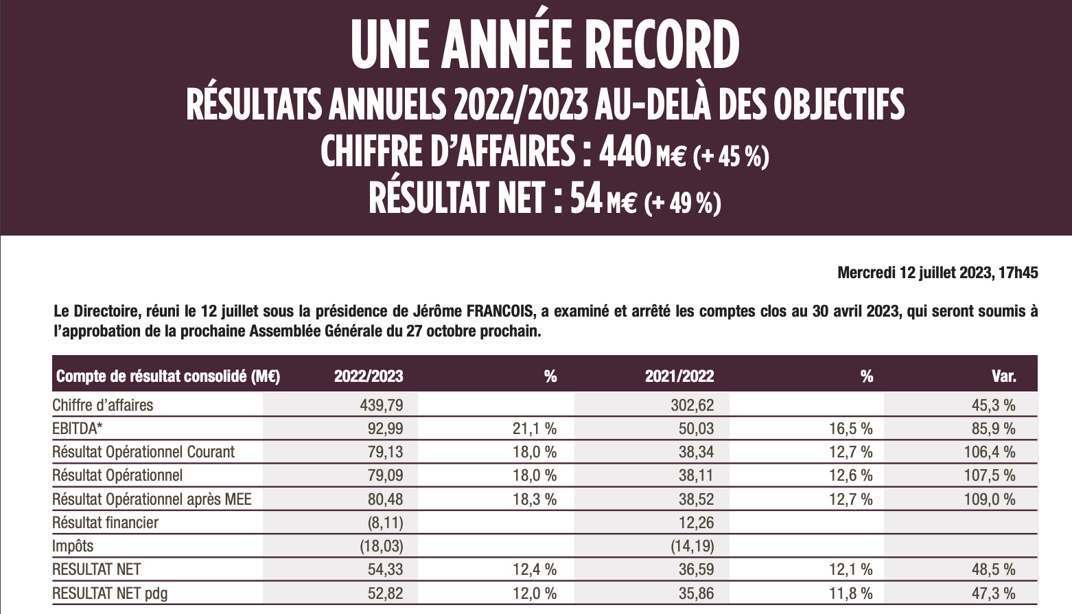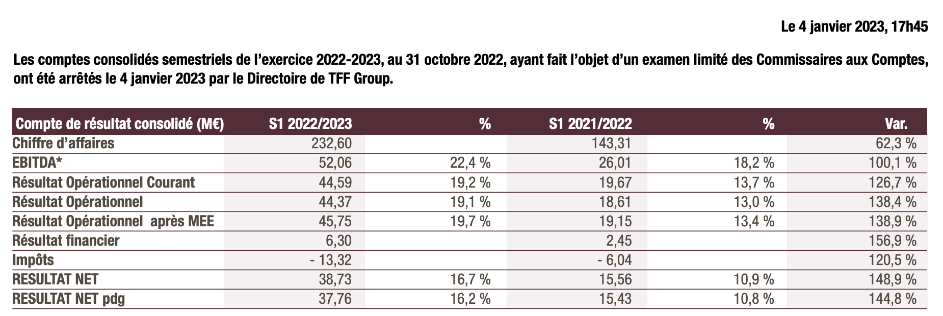 TFF a publié le 12/07/23 ses Résultats annuels. Ils dépassent les prévisions de +10% avec un CA qui atteint 440M soit une croissance annuelle exceptionnelle de +45% (dont 35% en organique) qui se traduit d'autant en bas de ligne avec un Résultat Net (part du groupe) qui progresse de +47% en atteignant 52.8M, bien que plombé par un résultat financier négatif de -8.11M (pertes de change et augmentation du coût de la dette).