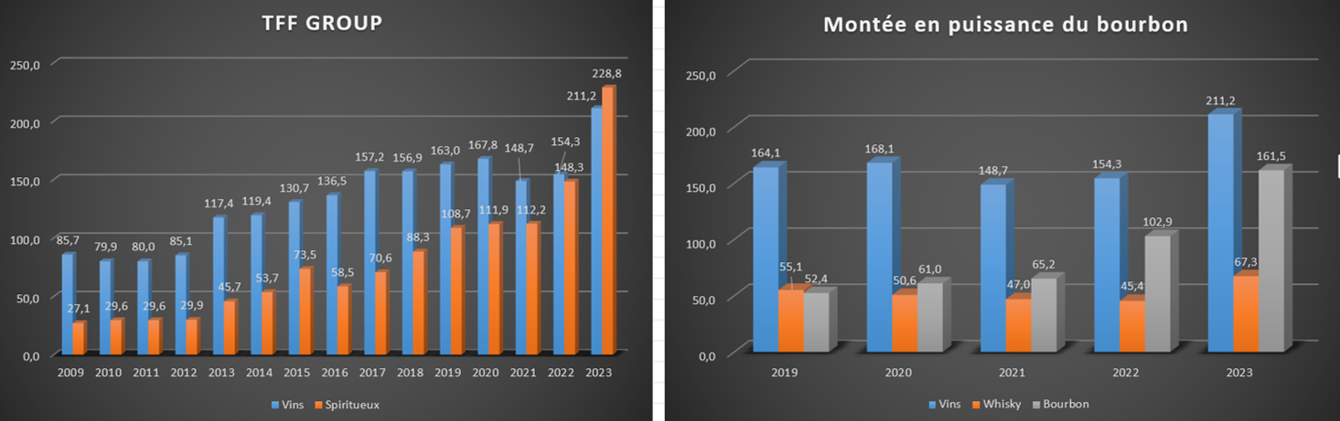 Marché du Bourbon : selon TFF le marché du Bourbon a encore plus de potentiel de croissance que le Whisky et TFF ambitionne une position de leader sur ce marché. Il a déjà été investi 150M€ depuis 2016 sur ce segment avec pour objectif de doubler les volumes.
