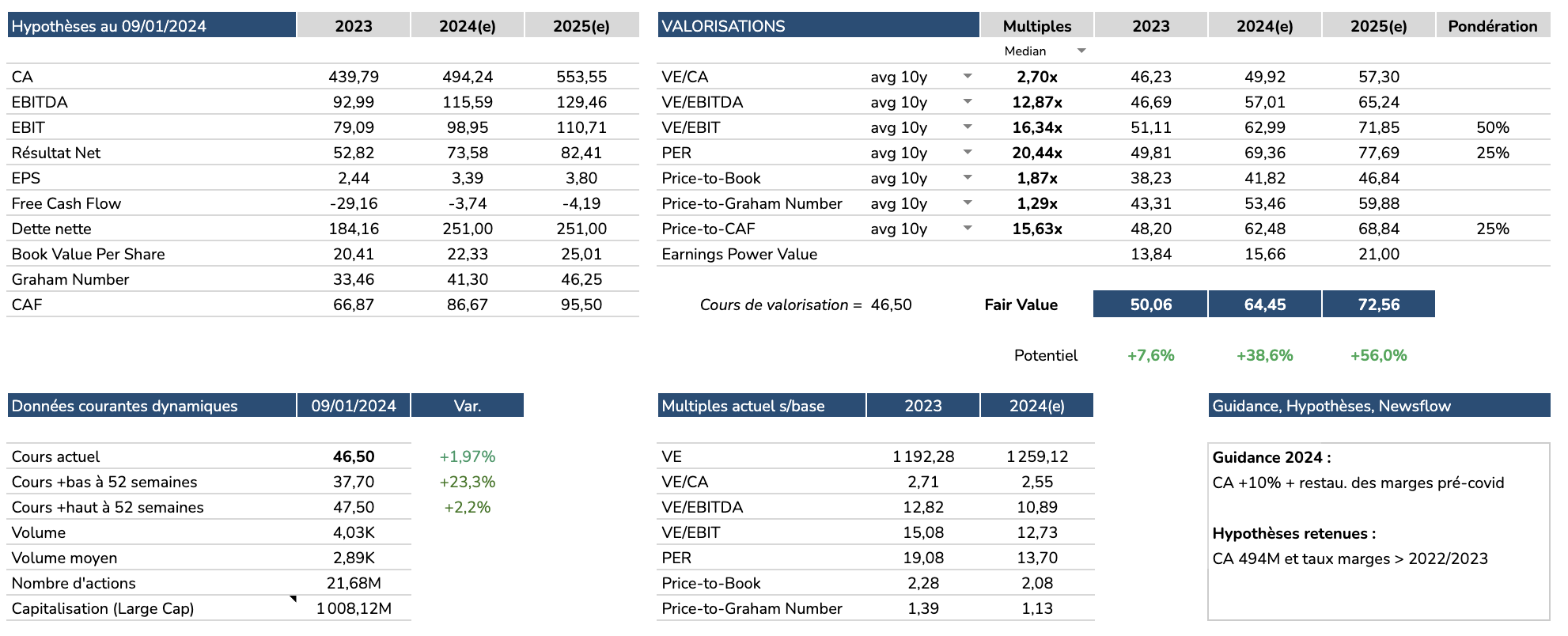 Actualisation de la valorisation : Fair Value estimée à 64.65 EUR soit potentiel de +38% en mixant VE/EBIT, PER et Price-to-CAF.